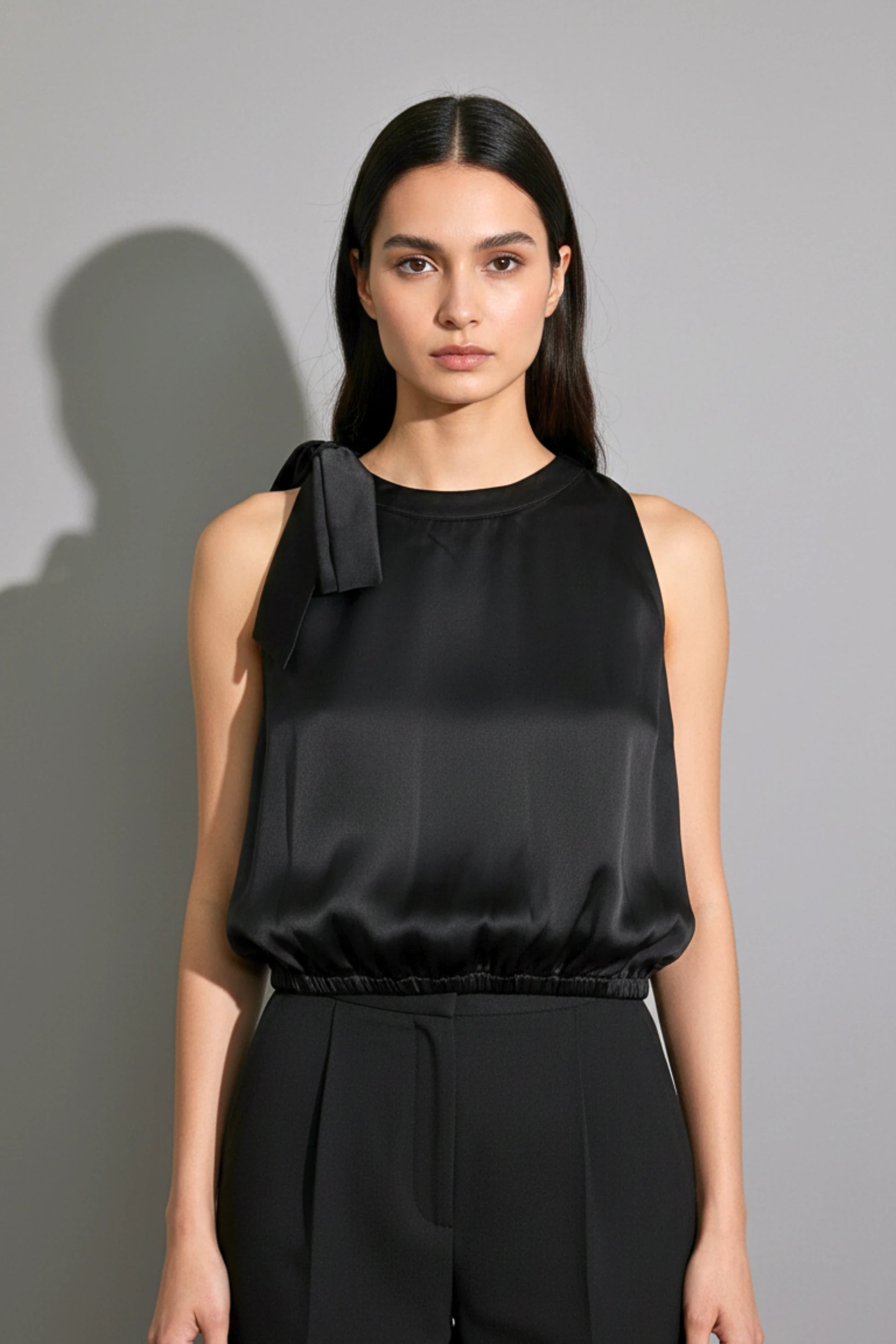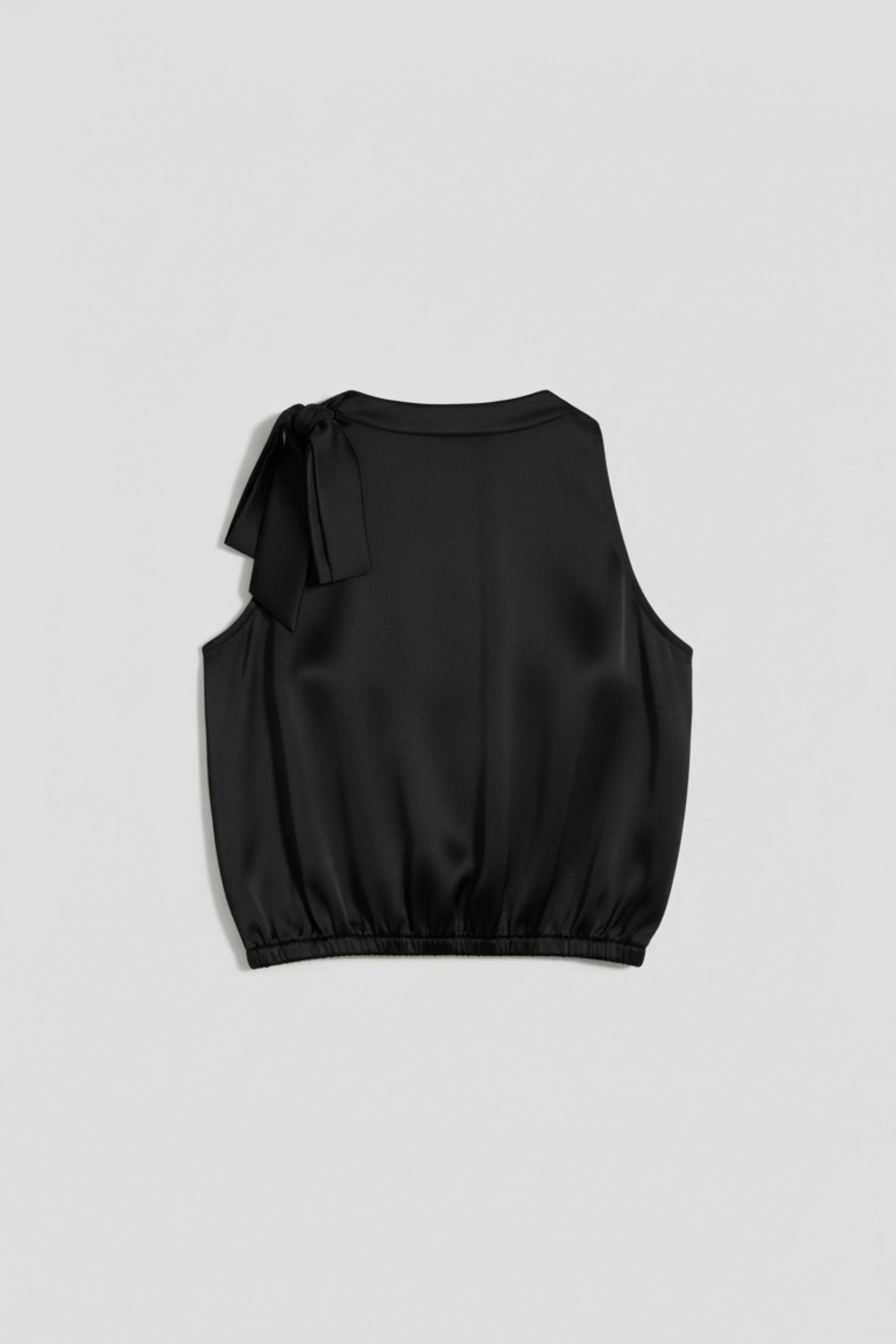 This black asymmetric halter crop top delivers clean drama without trying too hard. Crafted from premium soft satin, it has that fluid, luxe sheen that instantly elevates your silhouette. The bottom hem is elasticated to cinch the waist and enhance the drape - no sagging, no awkward fit, just a sharp, sculpted look.