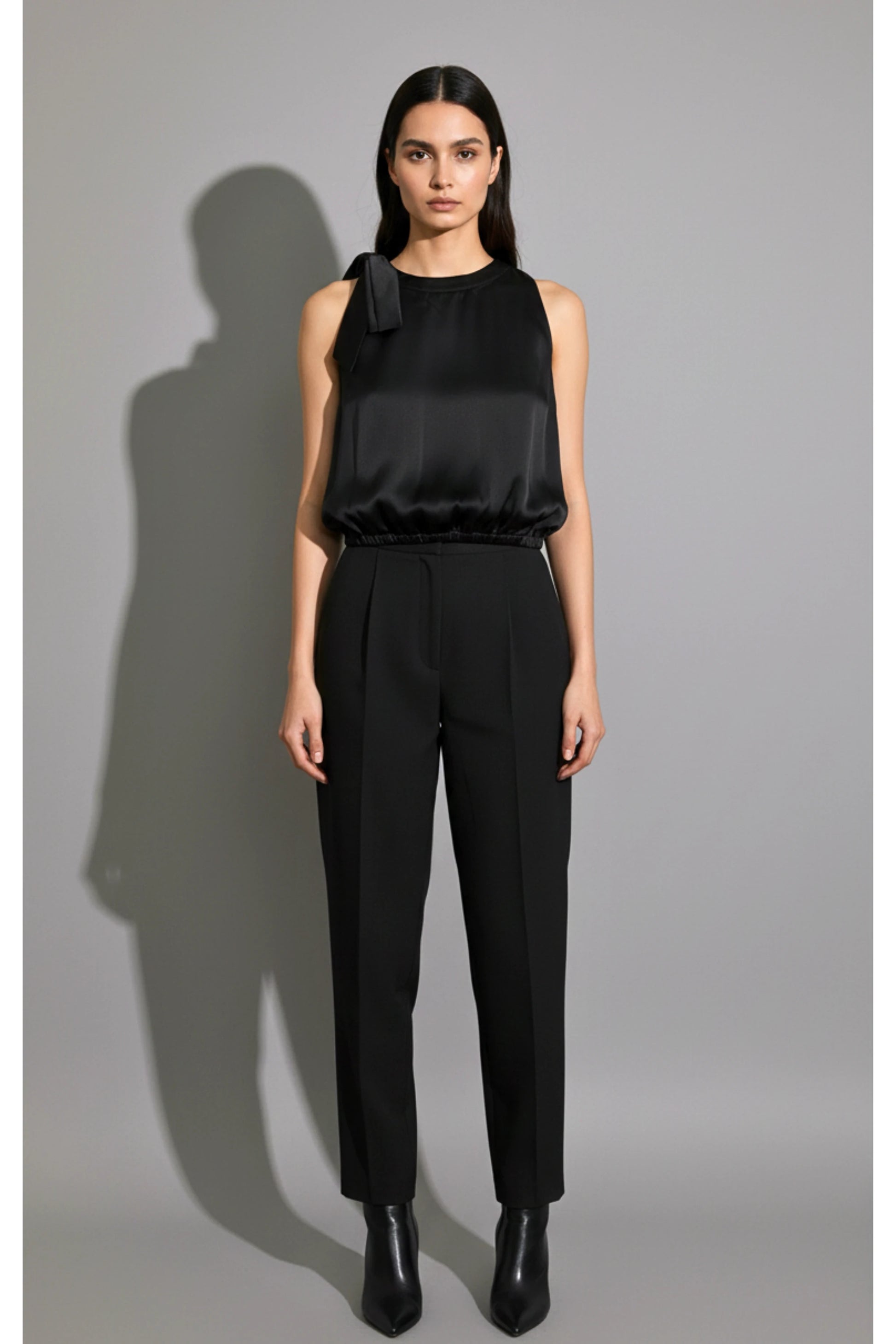 Styling Tip: Pair with high-waisted straight pants, metallic accessories, a sleek ponytail, and pointed heels.