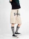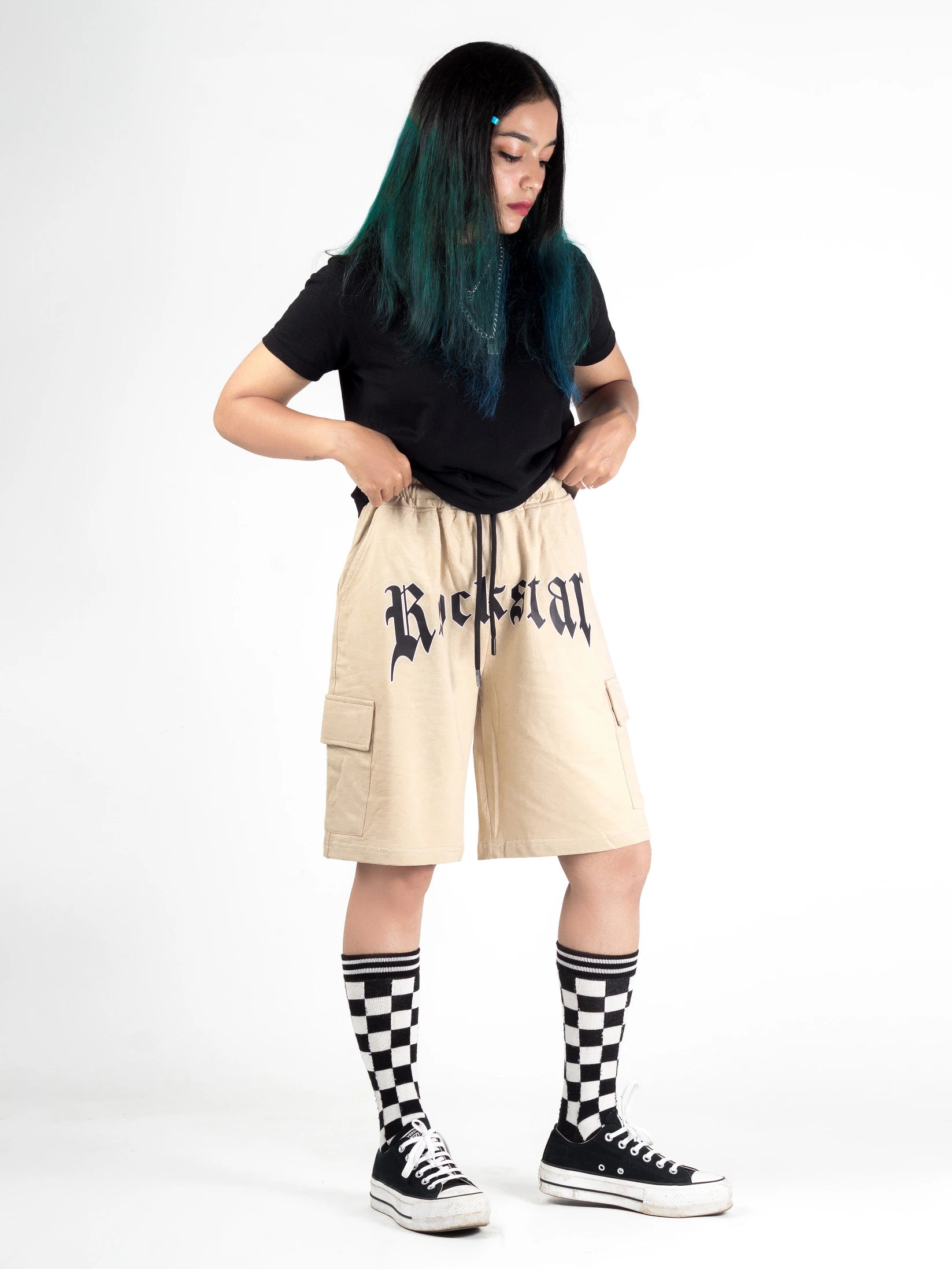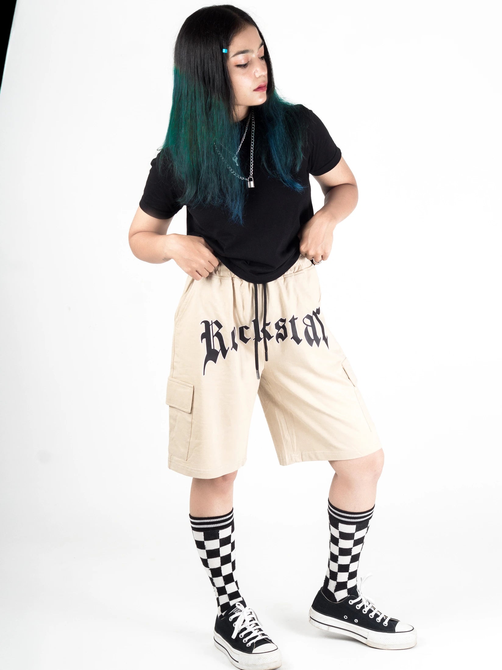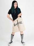 Introducing the epitome of edgy elegance and Y2K revival in fashion - Relaxed Fit Beige Rockstar Shorts for women by Skream Streetwear. Crafted with care from high-quality cotton fabric weighing 240 gsm, these shorts effortlessly combine comfort and style, delivering a flawless blend of the goth and rock 'n' roll aesthetics that defined an era.